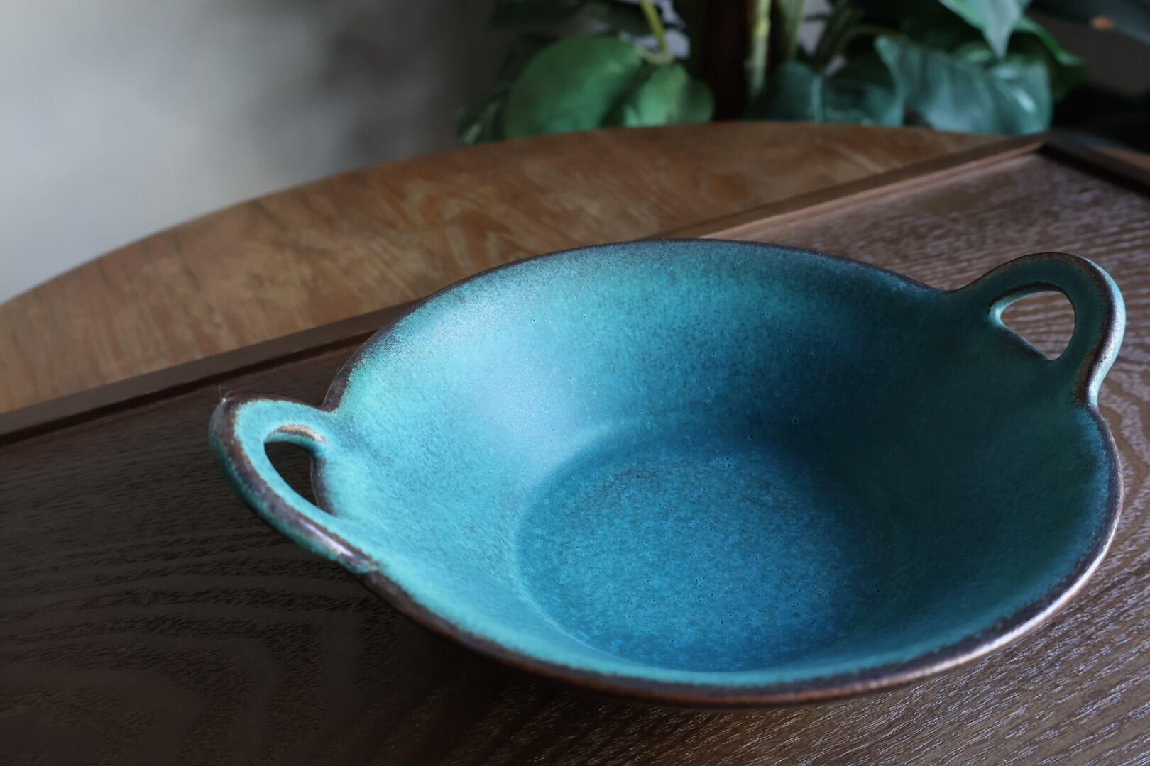 益子焼 わかさま陶芸 手付朝顔鉢 シャビーターコイズ