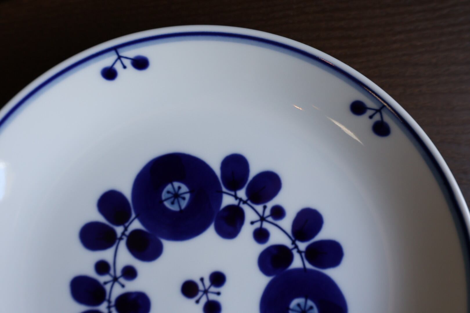 白磁に瑠璃色の花をみずみずしいタッチで手描きした白山陶器の「ブルーム」シリーズ。