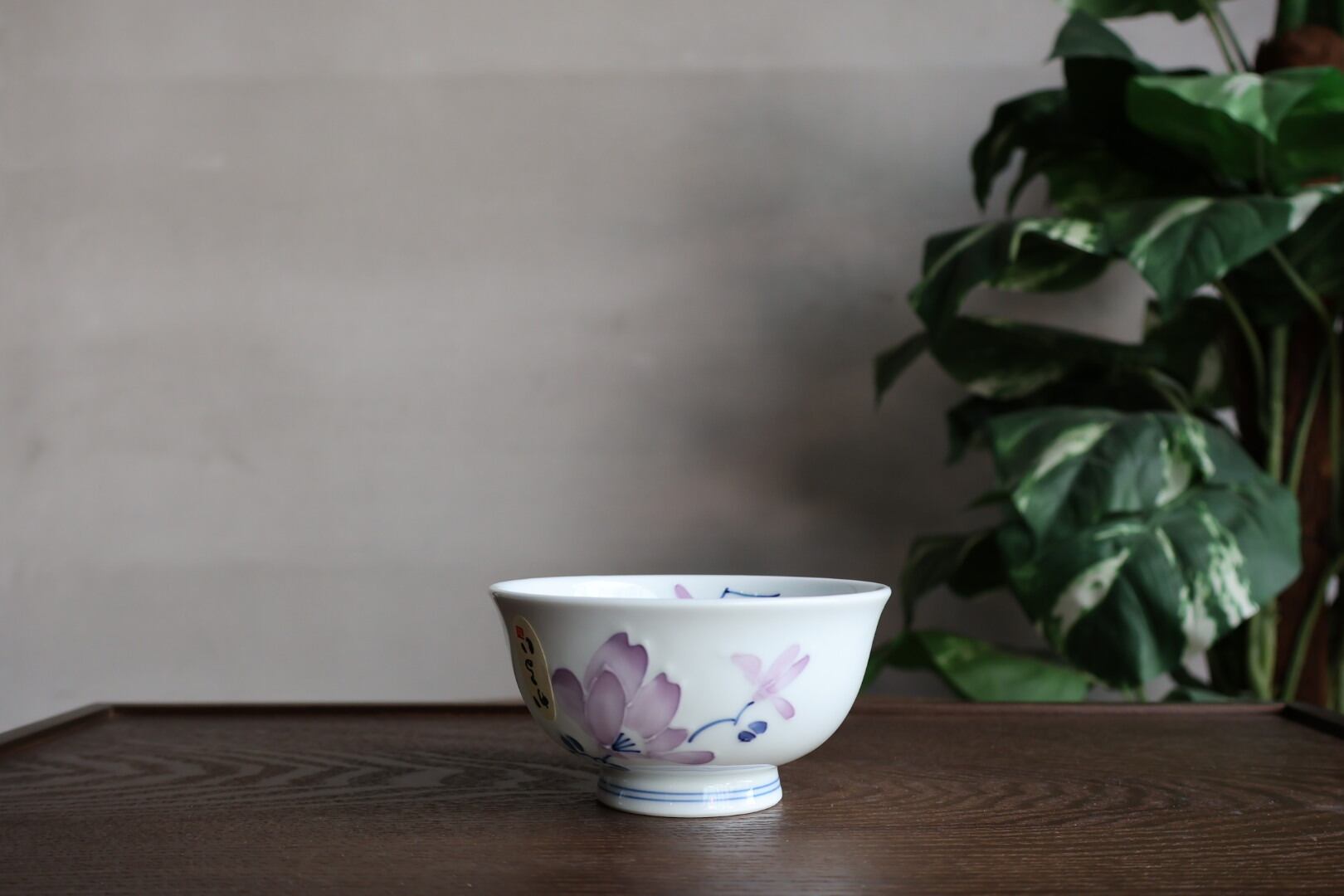 内側と外側に描かれた淡い色の花モチーフが素敵な波佐見焼の軽量飯碗です。