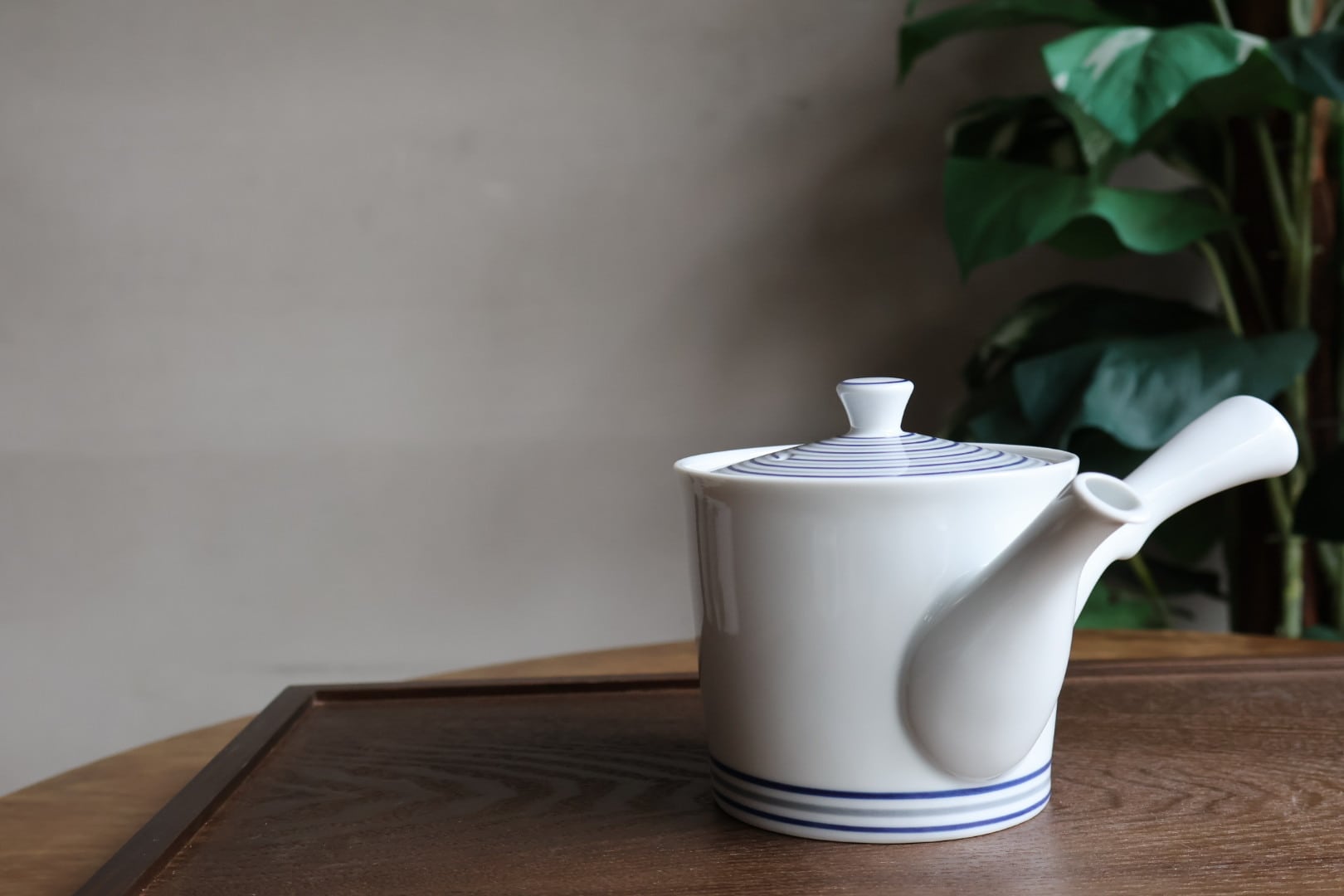 シンプルな白磁に描かれた二色の渦模様のデザインが素敵な波佐見焼のポット。
