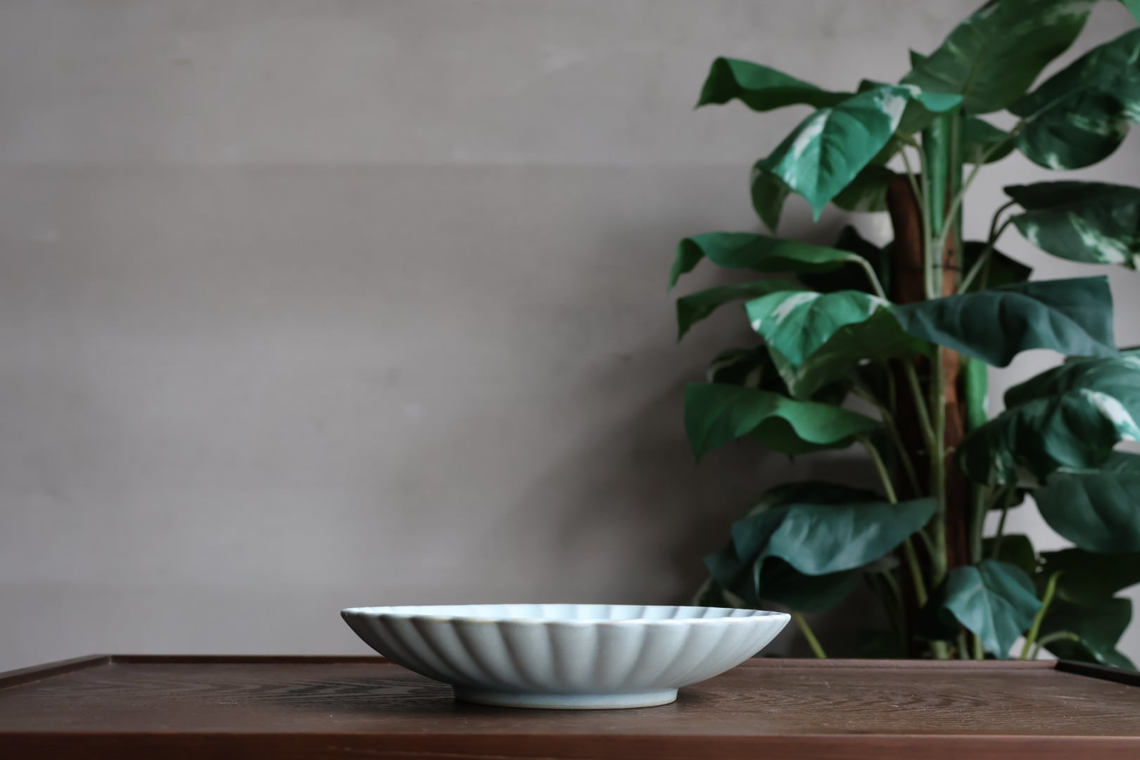 花びらのようなふちが上品なアクセントの瀬戸焼の土ものの器 Hana シリーズの中皿(M)。